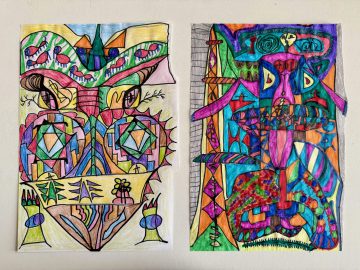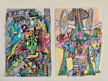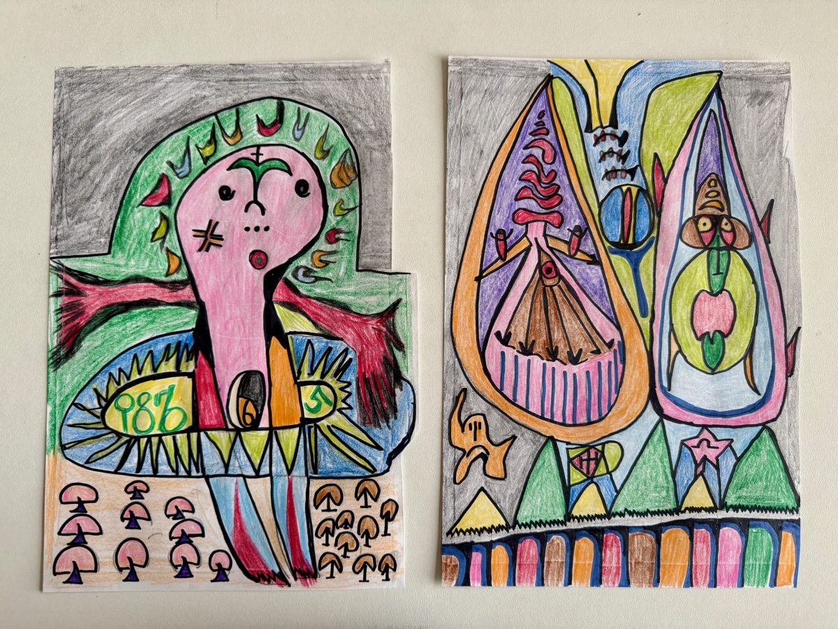 人間や動物が混ざり合ったハイブリッドな生き物たちを描き、画用紙の端が奇妙に切り取られているという謎めいた特徴を持つ。