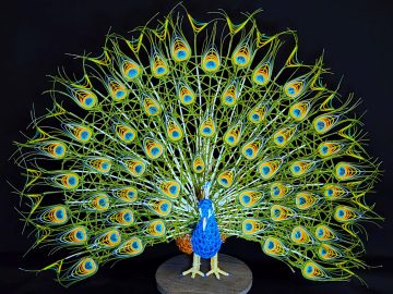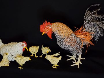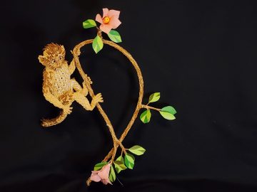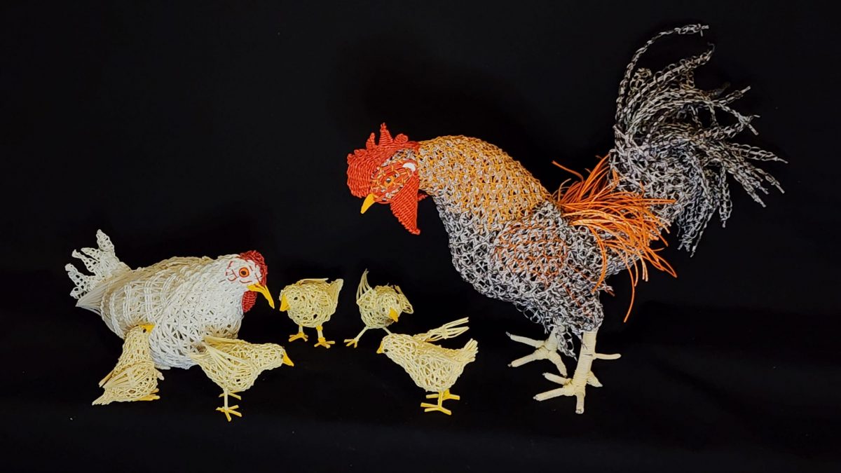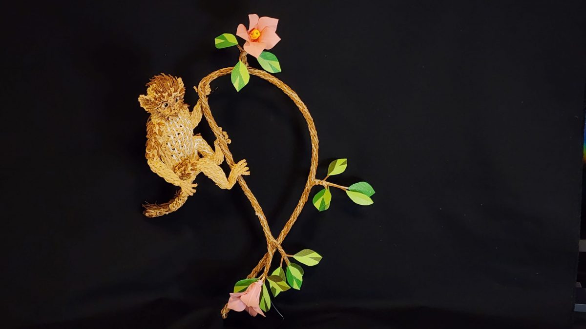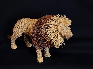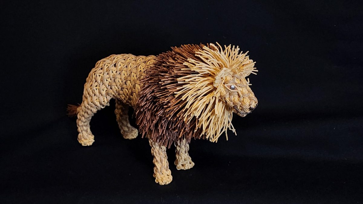 対象の生態に合わせ「鱗崩し華編み」や「ねじり編み」など独自の複数の技法を使い分け、設計図を用いずに素材の強度と構造計算のみで自立させる工夫を施している。