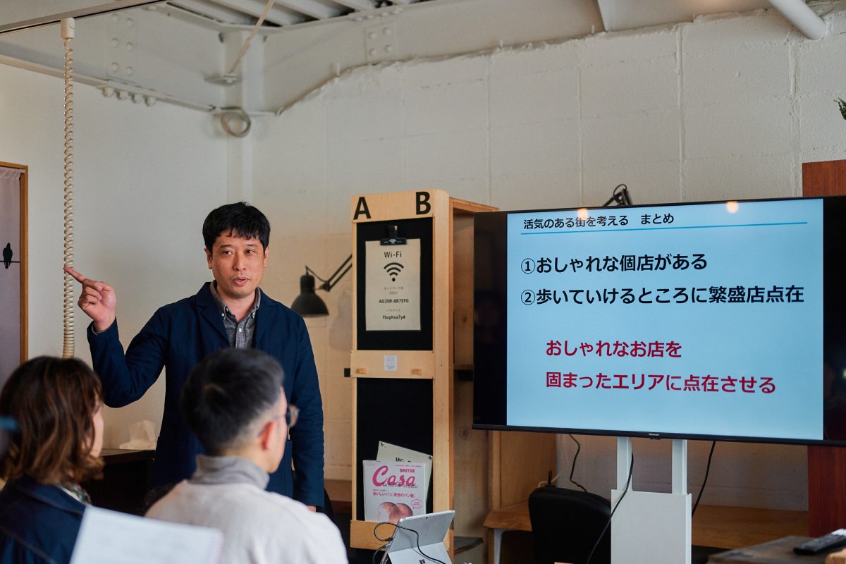 続いて、「有限会社日の出企画」代表の山田知弘さんより、不動産業と物件所有者の視点からの現状報告がありました。日の出企画は、住宅や相続の相談からまちづくりの企画・運営まで幅広く手がける会社で、不動産業者が扱いにくい物件を買い取ったり借り上げたりしながら、コワーキングスペースや地域交流施設として再生し、エリアごとに設定したコンセプトをもとに事業を展開しています。