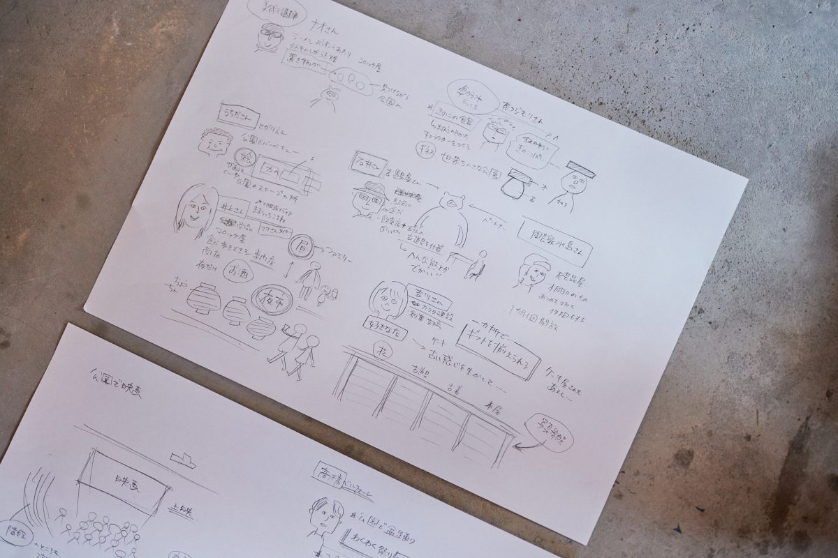 それらの妄想をサノさんがその場で描いていきます。言葉では伝わりにくいまちの可能性が、イラストとして積み重なっていきました。このイラストは、後日ひとつの絵としてまとめられ、街に展示される予定です。