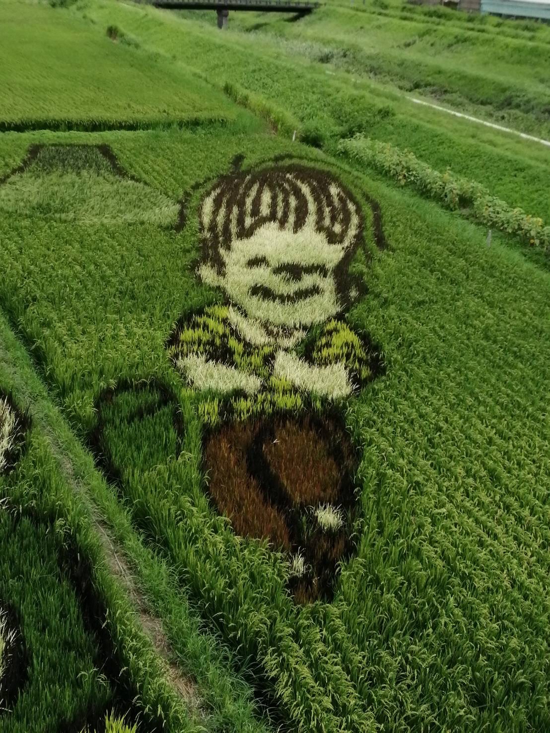 下からでは何の変哲もない田んぼですが、田んぼの横に備えられたやぐらの上から見ると、田んぼいっぱいに絵が描かれています。