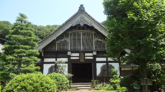 三島市郊外にある日蓮宗の古刹。百間塀に囲まれた広い境内は菩提樹『沙羅双樹(さらそうじゅ)』などが茂り、山間の寺らしい趣があります。