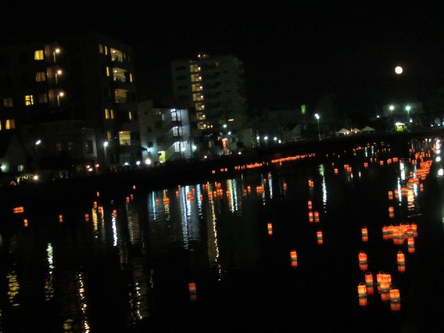 巴川の稚児橋から、数多くの灯ろうを流します。