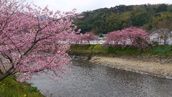 河津の桜並木は、河津駅近辺の河口から峰温泉までの河津川沿いに約3キロメートル続いており、そこで見られる河津桜は、開花時期が通常より早めで、2月上旬から3月上旬まで、約1ヶ月にわたって咲きます。