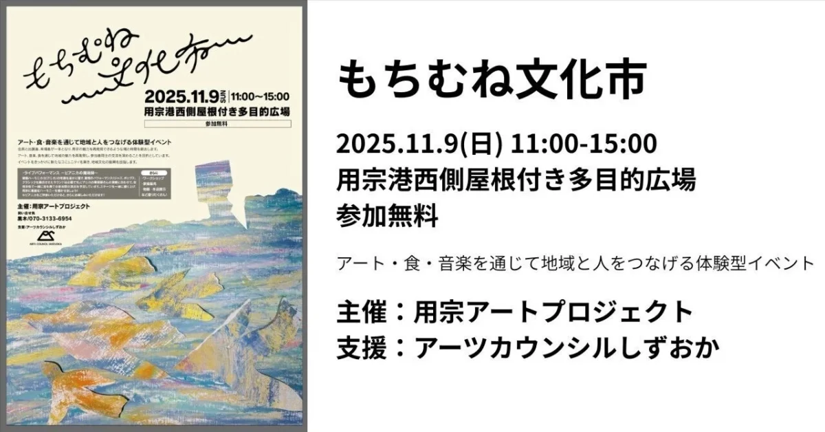しらず漁で有名なみなとまち用宗で展開する、用宗アートプロジェクトのプログラムのひとつとして、アート・食・音楽を通じて、地域と人がつながる体験型イベント「もちむね文化市」の開催が決定しました!