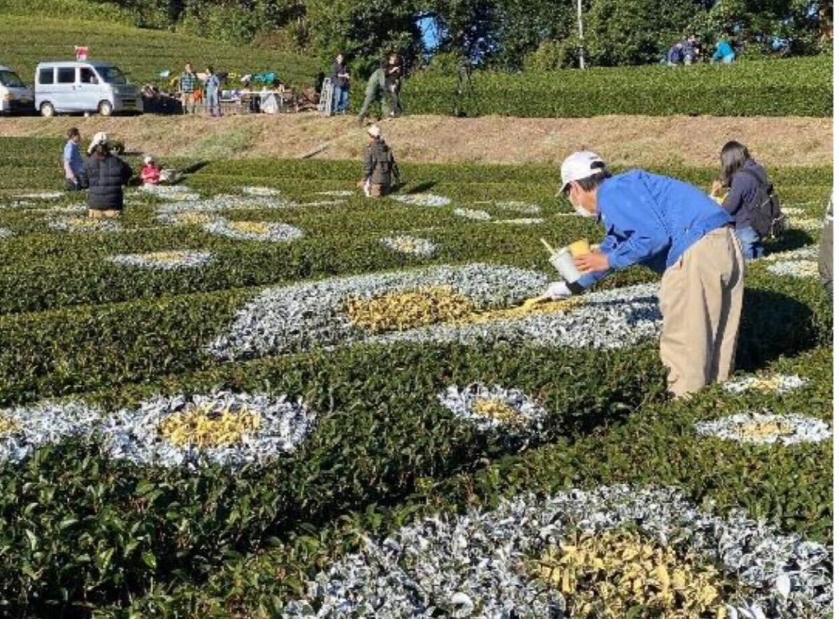 「UNMANNED 無人駅の芸術祭/大井川」参加アーティストTAKAGIKAORU と地域団体「抜里(ぬくり)エコポリス」が協働し、抜里の収穫をやめた茶畑をキャンバスに参加者自身の手で鮮やかに“色を描く”取り組みです。
