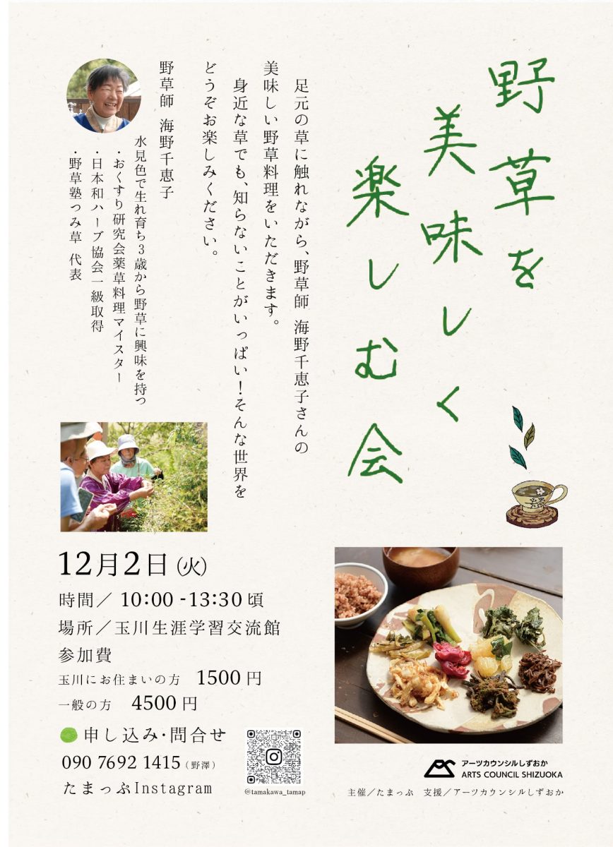 | 講師 | 海野千恵子(野草師) 水見色で生れ育ち3歳から野草に興味を持つ ・おくすり研究会薬草料理マイスター ・日本和ハーブ協会一級取得 ・野草塾つみ草 代表 |