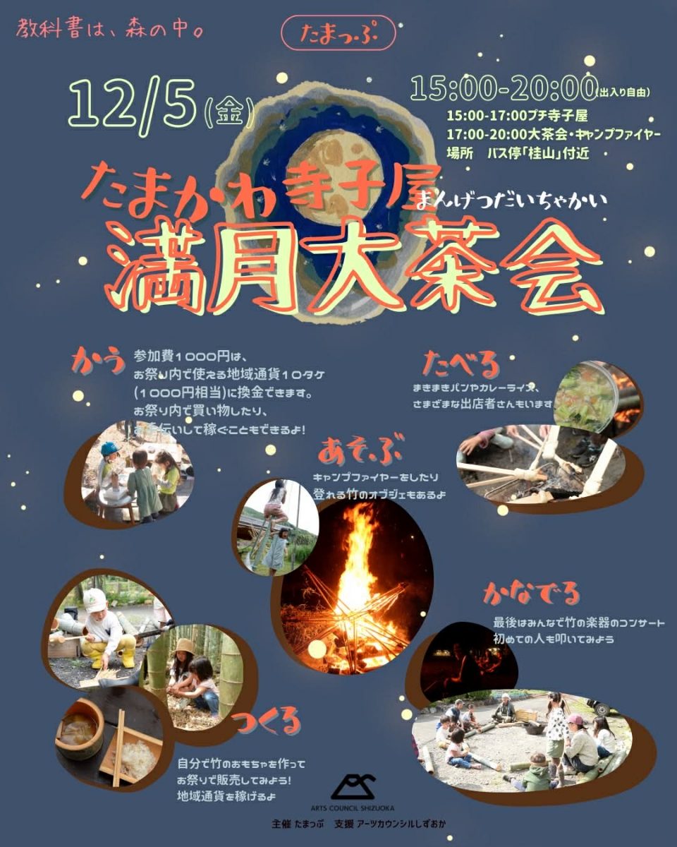 今回「たまかわ寺子屋」の一環で開催する「満月大茶会」は、満月の光を楽しみながら、静岡の文化であるお茶を飲み、集った人たちでそのひと時を楽しむお祭りです。お祭りでは、キャンプファイヤーを囲みながら、地域通貨の「タケ」を使ってお店で買い物をしたり、焚き火でマキマキパンを焼いたり♪満月と星空を見ながらの日詰明男さんによる宇宙の話もお楽しみいただけます。