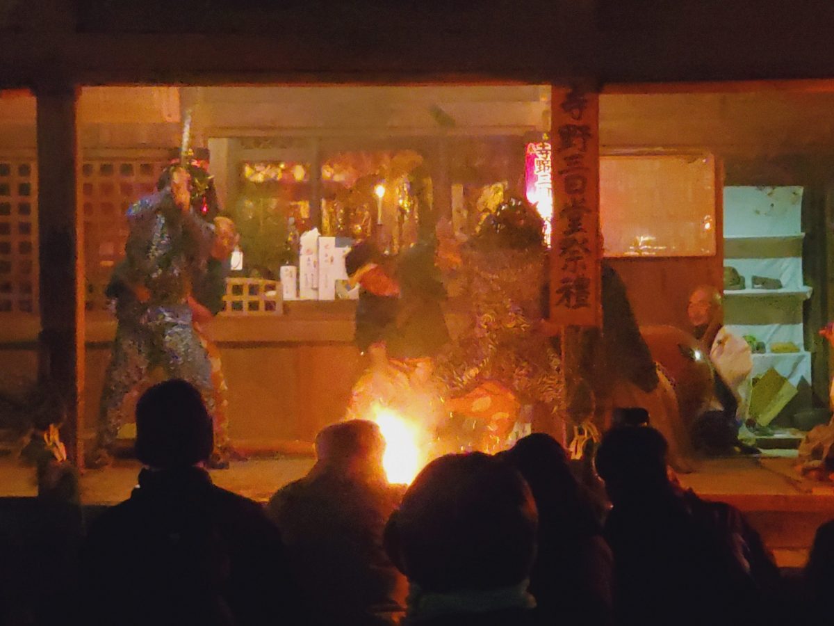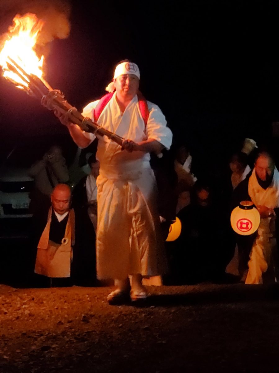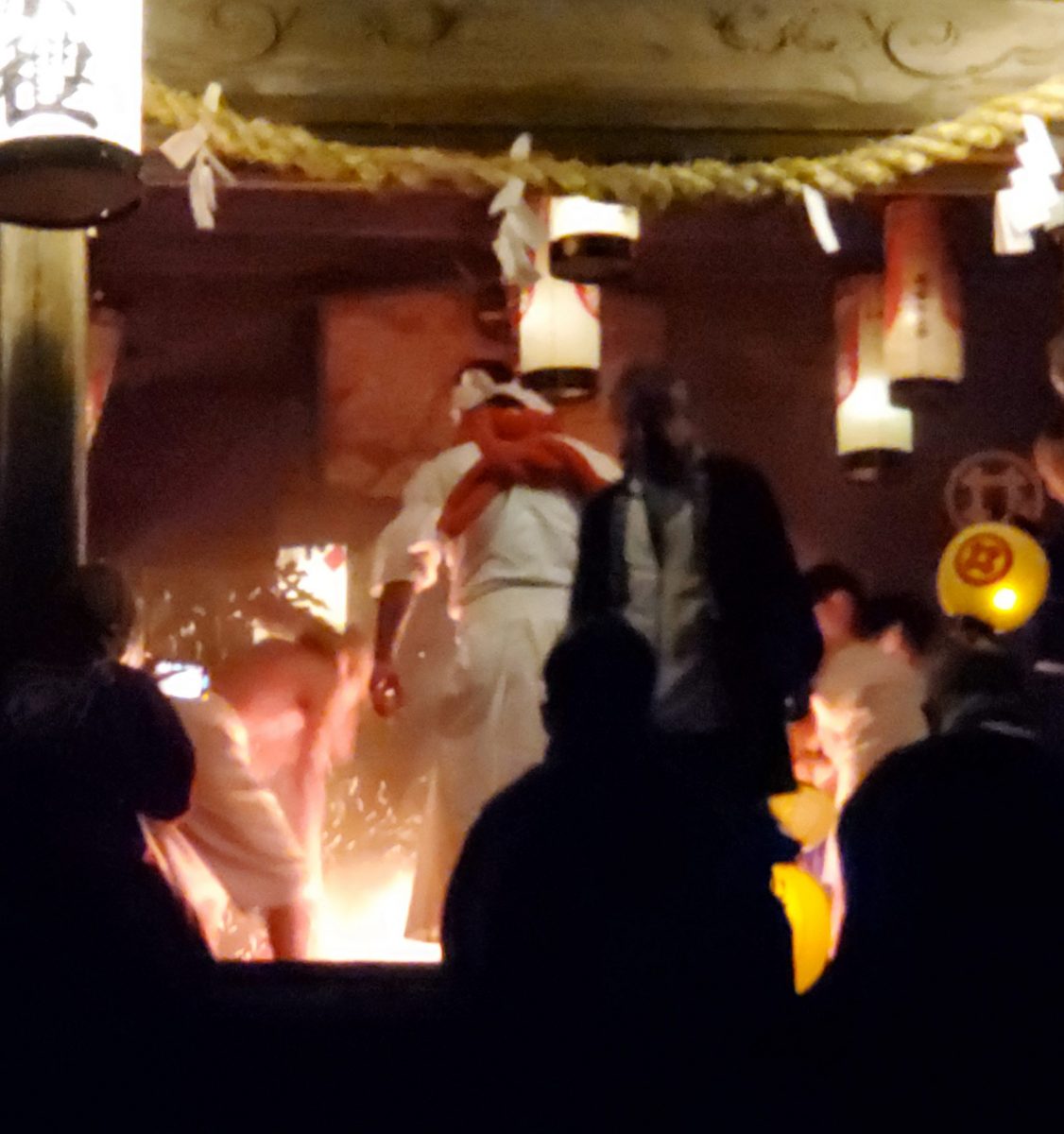 松明の火を鬼がたたいて消すのだが、動きがみごとで、あたりに火の粉が飛び散って、日が暮れるにつれ陰陽の変化が美しい。