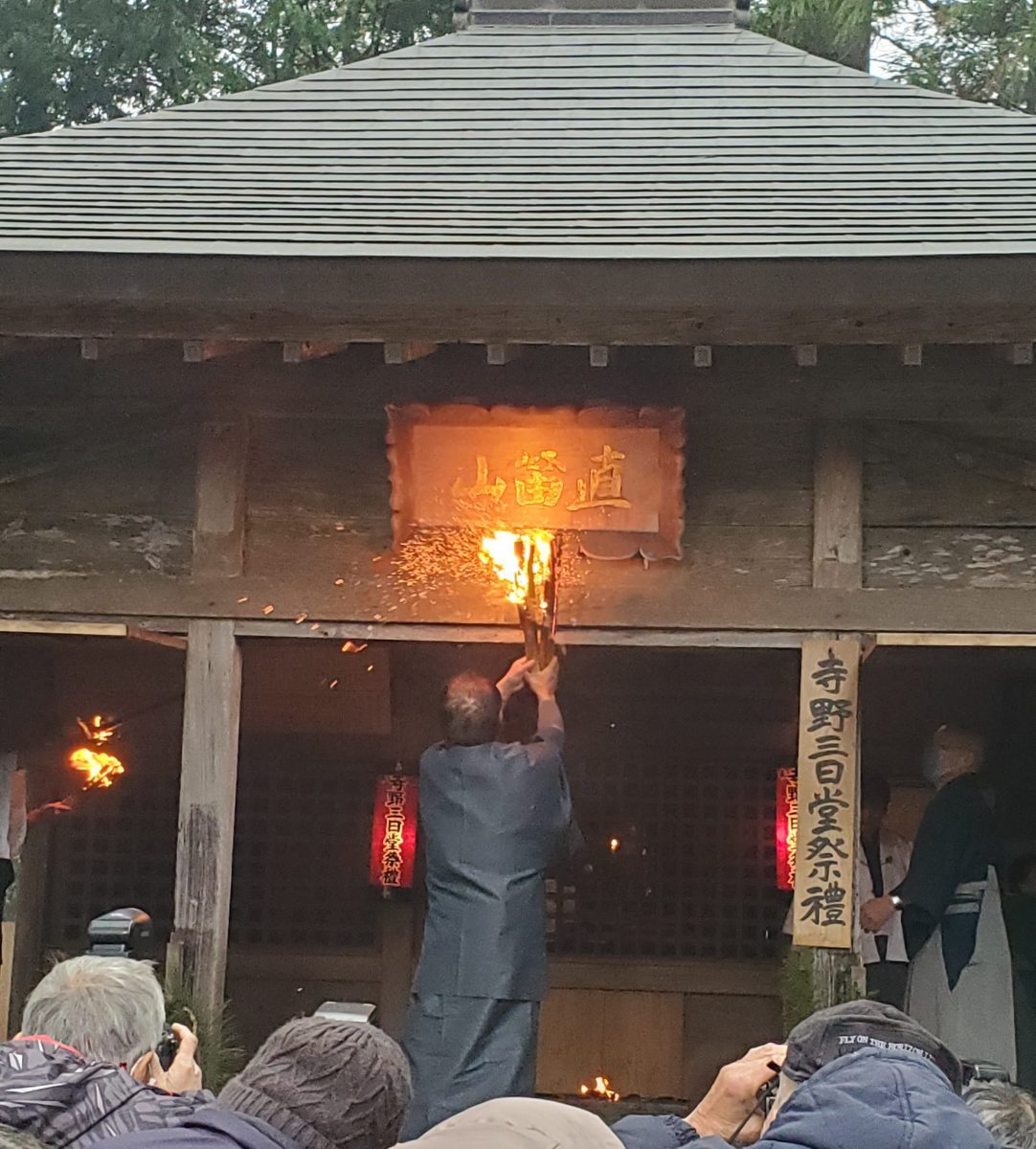 お堂に向かって右手の石段の上に小さな祠があり、その前に数名が座し、脇に火を焚いて、神事が始まる。