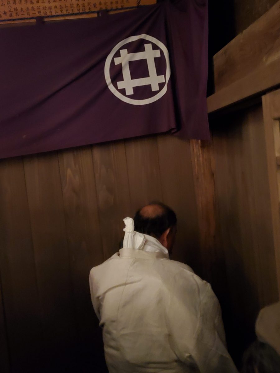 寺野では広場に椅子が並べられていたが、川名の場合は、狭いお堂の中で行われる舞を見続けるには、壁に背をつけて立ち続けているしかない。