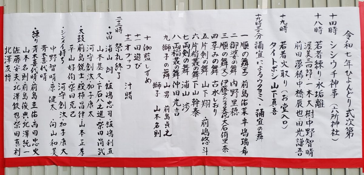 掲げられた「ひょんどり式次第」によると、すでに十四時には六所神社で「シシウチ神事」が行われたらしい。